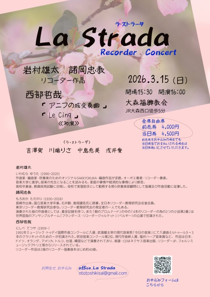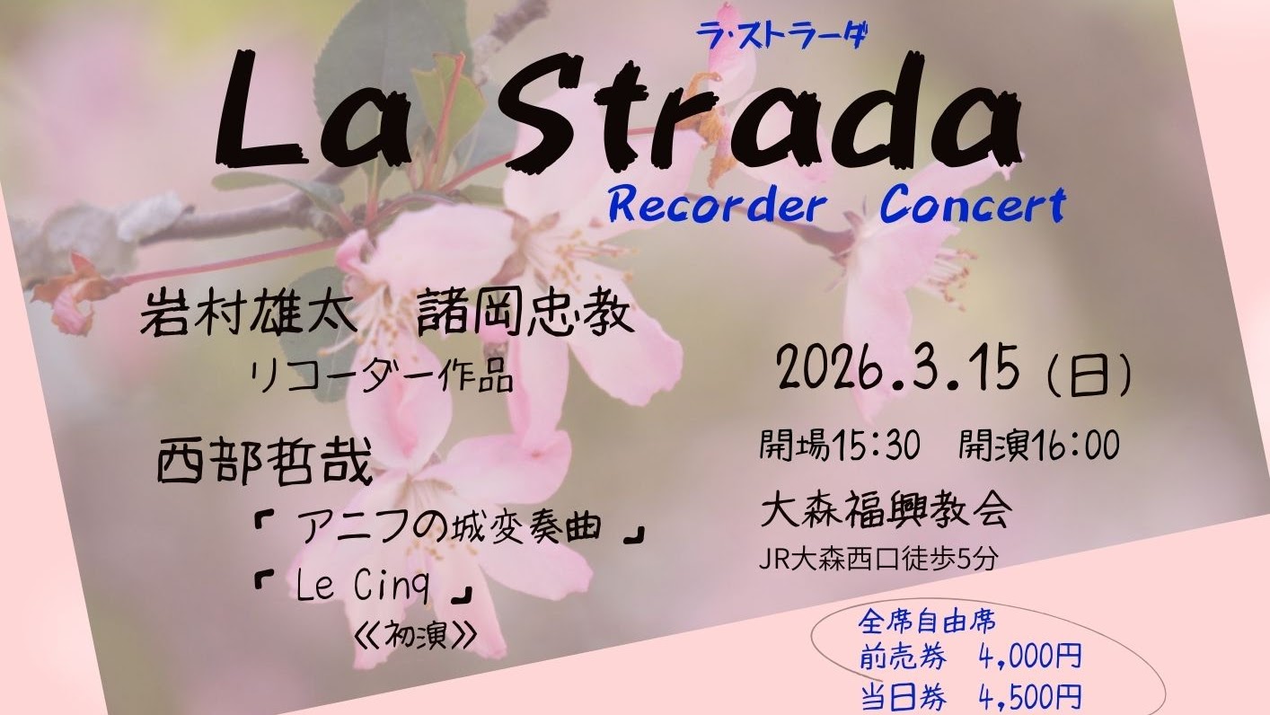 久しぶりにラ・ストラーダで、コンサートを行います!今回は3名の日本人作曲家の作品を取り上げます。高校で吹奏楽部顧問を務める傍ら作曲・編曲を多数手がけた岩村雄太先生、リコーダー教育研究会の発足者の一人である諸岡忠教先生、そしてリコーダーのために約40もの作品を書いている西部哲也先生です。西部先生による2曲は初演となります!新しい作品との出会いはいつもワクワクします。