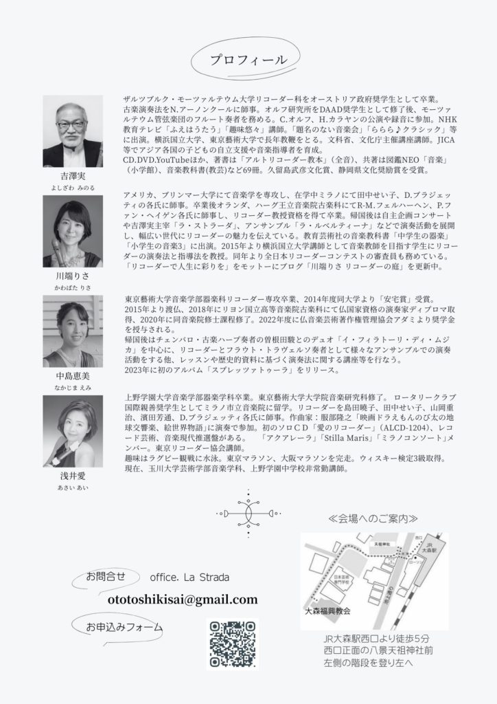 リコーダーという楽器はバロック時代に全盛期を迎えた後、一度は忘れられた存在となりました。20世紀初頭、古楽復興運動の中でリコーダーが復興されて以降、リコーダーのために新しい作品が書かれ続けてきました。それはリコーダーが今も発展し続けている楽器であることの証です。ラ・ストラーダの一員として、リコーダーの未来を紡ぐお役に立てることをとても光栄に思います!